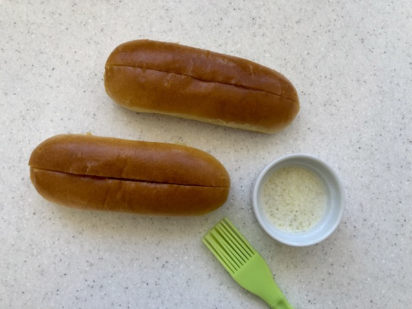 Preheat oven to 350 degrees. Lightly brush inside of each roll with melted butter. Bake for 5 minutes or until lightly toasted. Set aside.