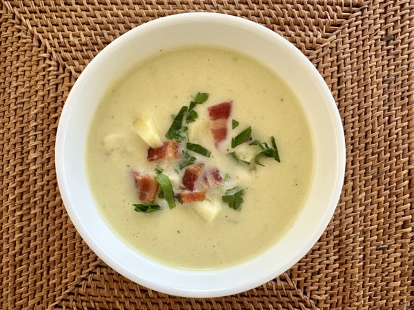 Remove the bay leaf. With a hand blender carefully puree the soup. Stir in the heavy cream. And heat through.