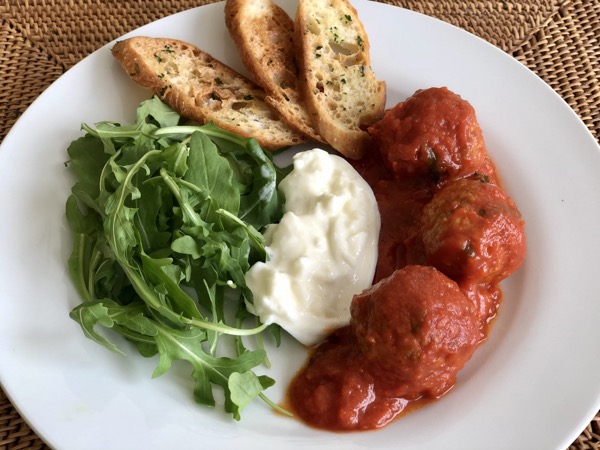 Place the arugula salad on one side of the plate. Lift the meatballs out of the sauce and place on the other side of the plate. Spoon a little marinara around the meatballs. Place two slices of burrata in the middle. Garnish with some fresh basil. Place crostini on the top of the plate above the arugula salad and burrata.