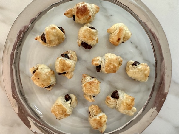 Cut a sheet of thawed frozen puff pastry lengthwise into five strips, then cut crosswise into thirds to make 15 rectangles. Slice each rectangle diagonally to make 30 triangles.