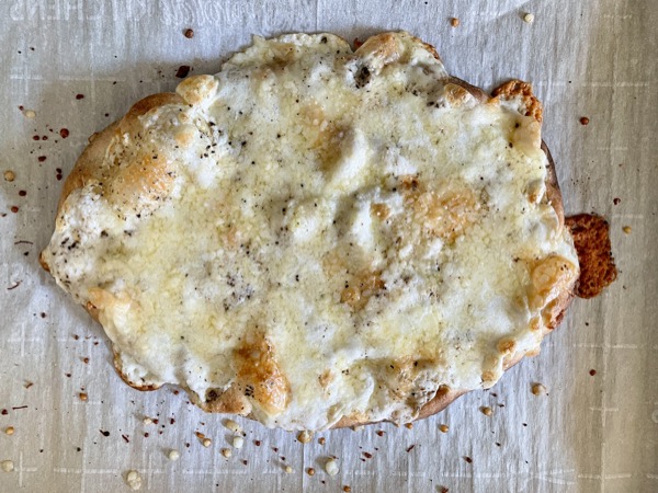 Drizzle the cream over the naan. Scatter with the grated garlic. Top with the mozzarella, then the taleggio. Grind a generous amount of pepper on top of each.