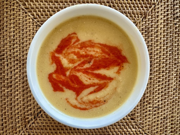 To serve, ladle the warm soup into individual soup bowls. Swirl about 2 tablespoons red pepper pesto into each bowl.